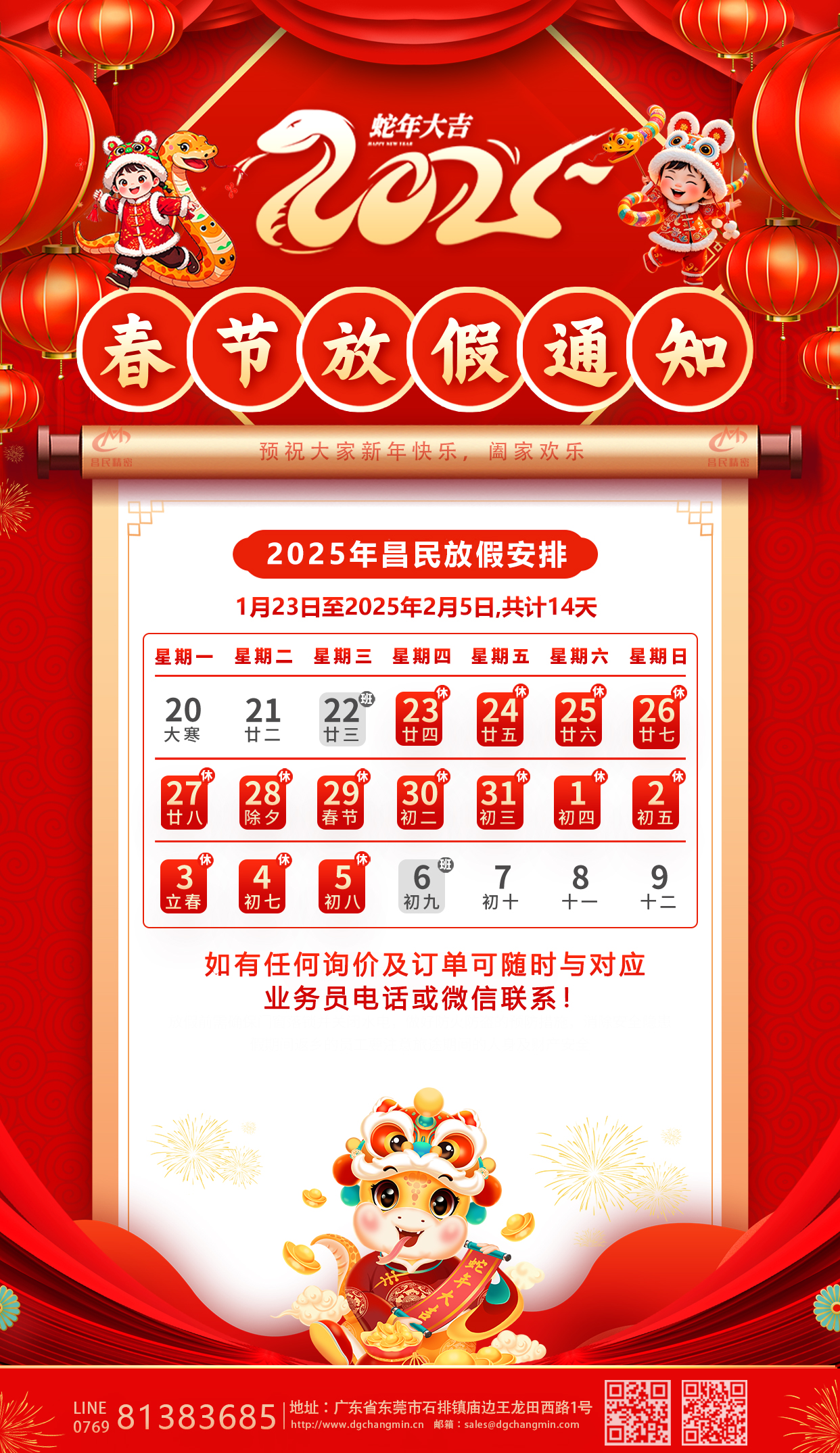 值此新春佳节来临之际,为让大家拥有一个快乐而充实的春节,根据国家相关规定并结合我司实际情况放假通知安排如下:1月23日至2025年2月5日,共计14天,2025年2月6日开工正式上班。期间,大家可以尽情享受与家人团聚的美好时光,感受浓浓的年味! 在此,多宝全体同仁预祝大家新春快乐,阖家幸福,万事如意!最后,再次衷心感谢新老客户在过去一年里的支持与帮助,让我们共同期待2025年,大家一起携手前行,共创辉煌!